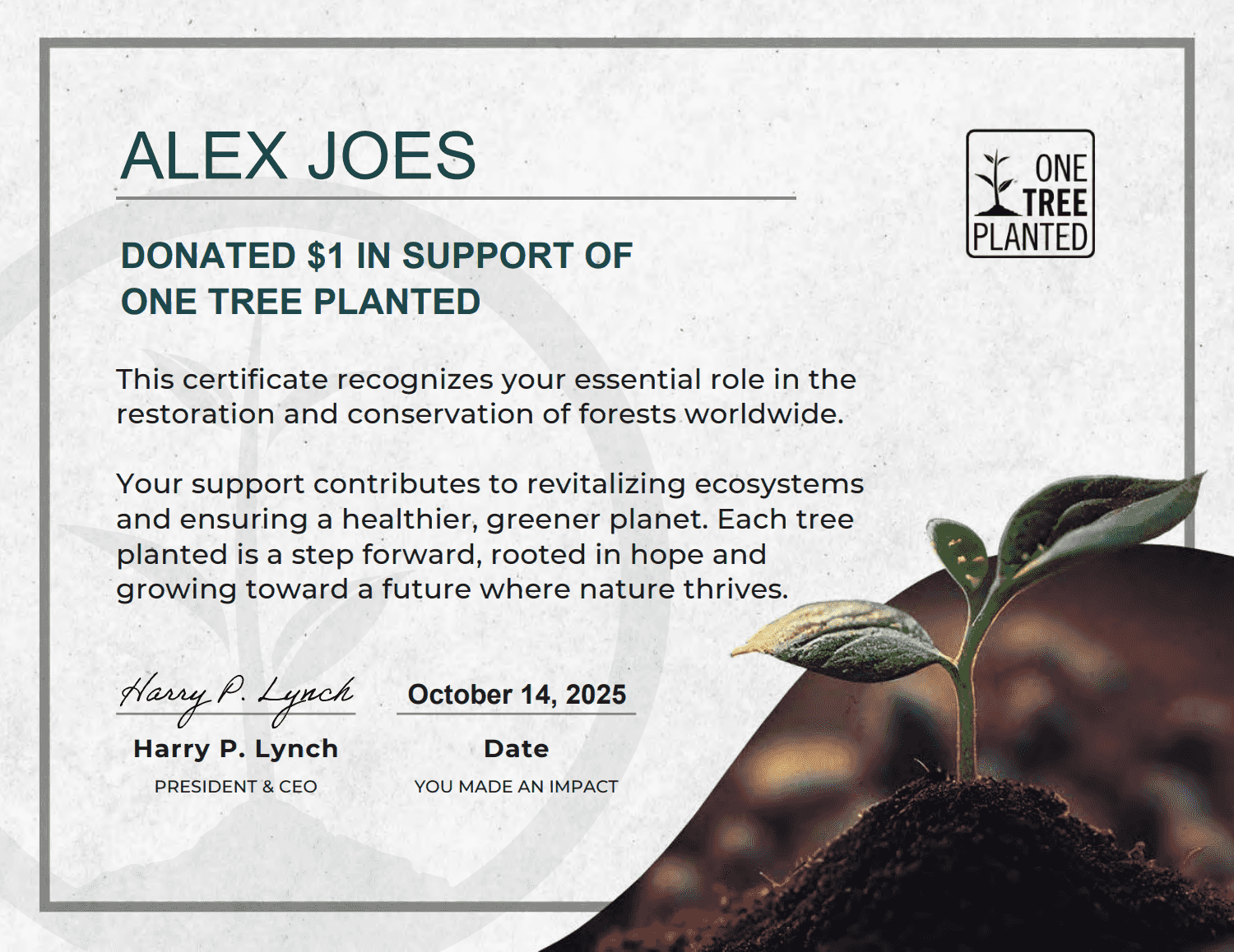 A personalized certificate will be sent to thank you for helping our planet thrive.